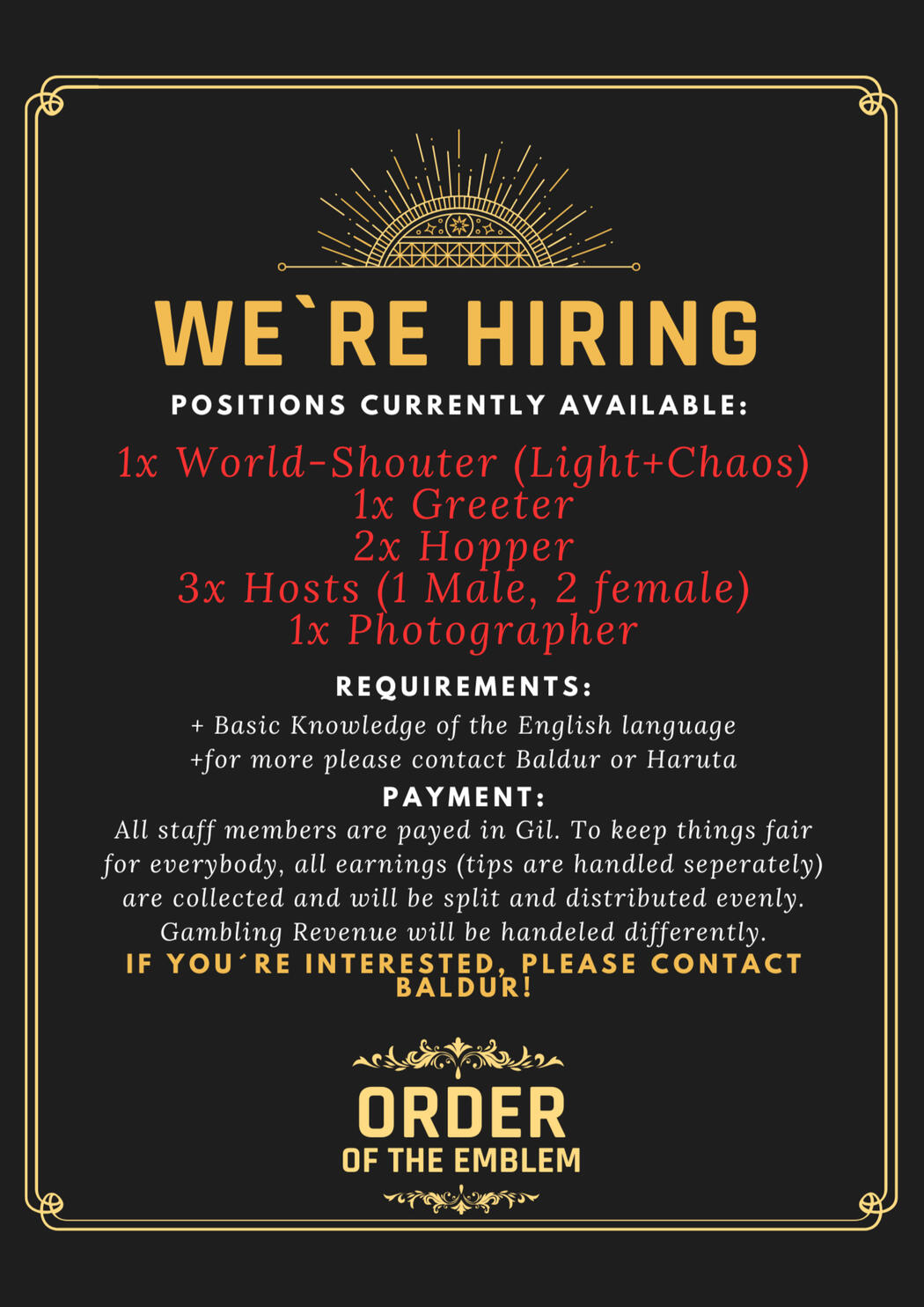 Hey, you! Yes, I´m talking to you! You´re looking for more than just a night of fun? You might even visited us and decided this is the place to stay with? Then you´re welcomed to join our ranks! That is as long as we got jobs to offer. But if there are any, then we´d be happy to hear from you. Just join our Discord and contact us! Don´t hesitate, your chance is now!